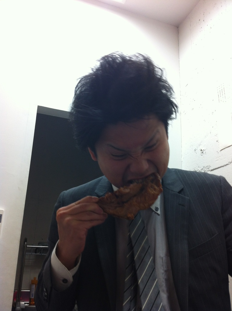 チキンにかぶりつく溝江社員(笑)
