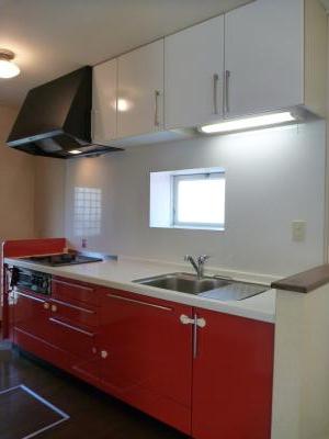 キッチンもしっかりリフォーム済みで赤が印象的な