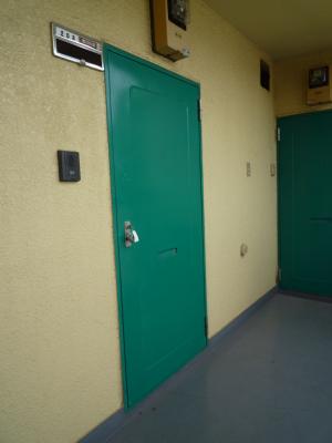 玄関扉は緑色のレトロ感漂う可愛い扉です
