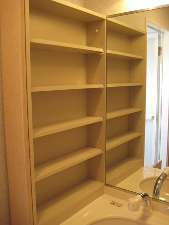 鏡横の両側の棚や下の収納もタオルや化粧品などを収納して頂けますので