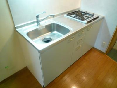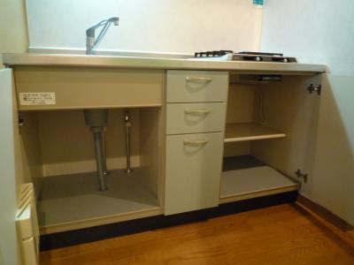 システムキッチンもガス2口で収納豊富な機能的なキッチンです