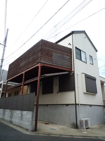 ウッドデッキバルコニーが天井代わりになっており